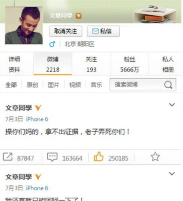 太多人骂她窝囊了,都不理解为什么她要去原谅一个伤害过自己的人,况且那个时候文章的名声也不好。 人狂自有天收 他靠着马伊琍火了起来,马伊琍把所有资源都给了他,再加上他确实在演戏上面有足够的天赋,很快就成了娱乐圈最火的小生了。 演什么像什么,但是他的人品真的让人难以评价,因为狂妄的脾气得罪了太多太多人。